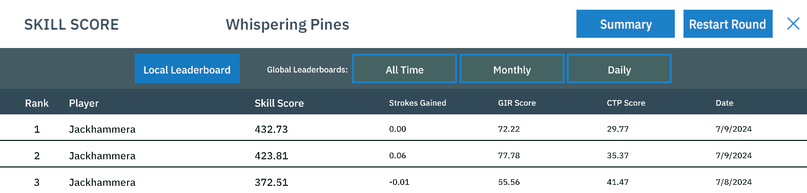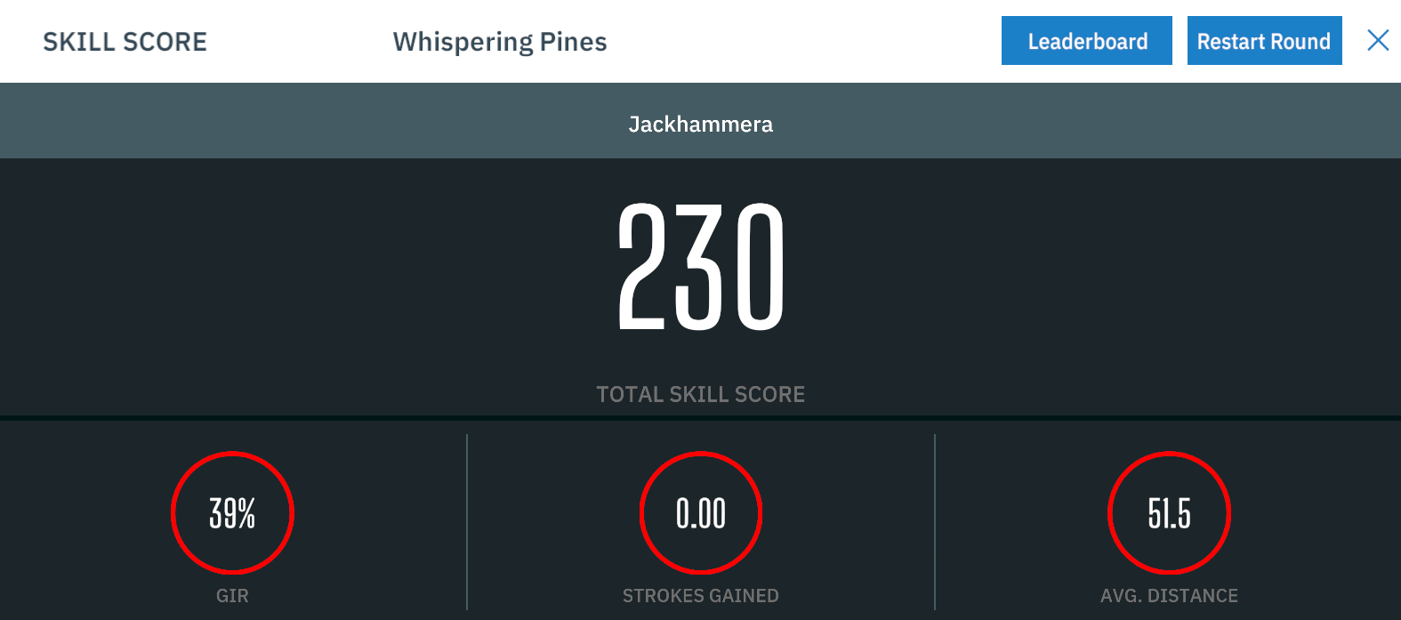 Once you have finished the Skills Test, you will have three options available to you in the top right corner of the scorecard. Exit the round by clicking the “X”, restarting the round, or checking the Leaderboard.