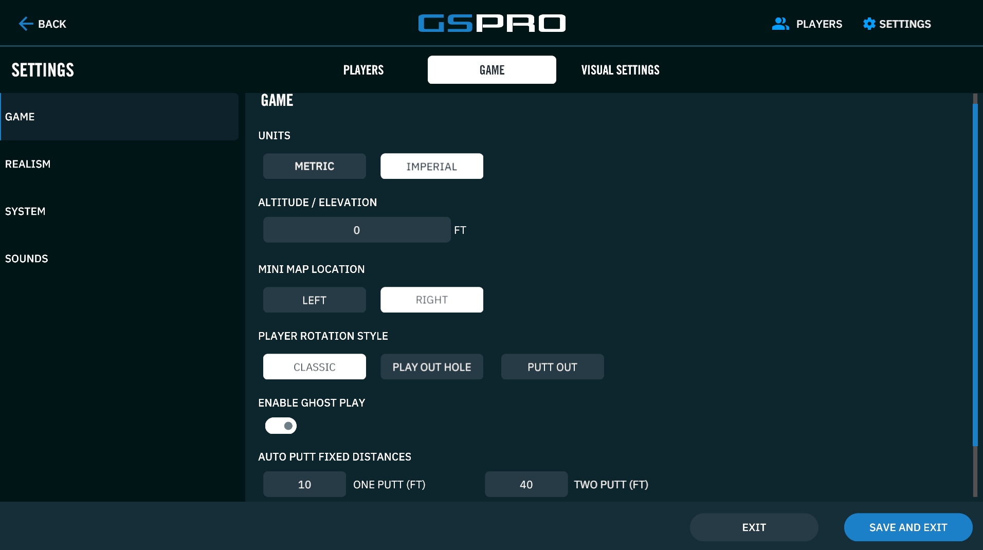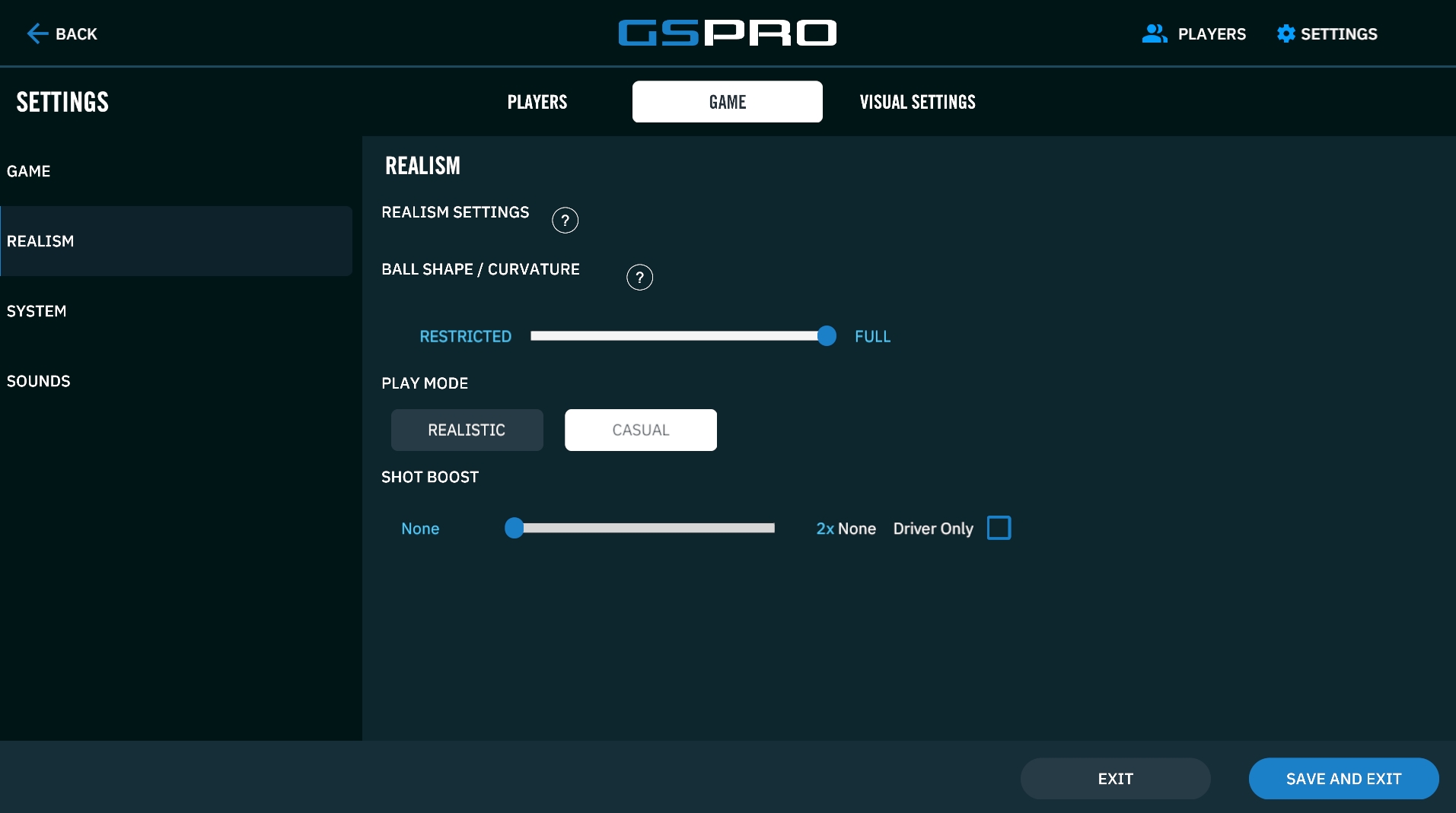 Realism: these settings allow you to adjust how forgiving GSPro Plays. There are various settings for how much side spin effects your ball flight (hooks and slices), how terrain penalties effect your ball (deep rough, etc) as well as distances (power boosting).