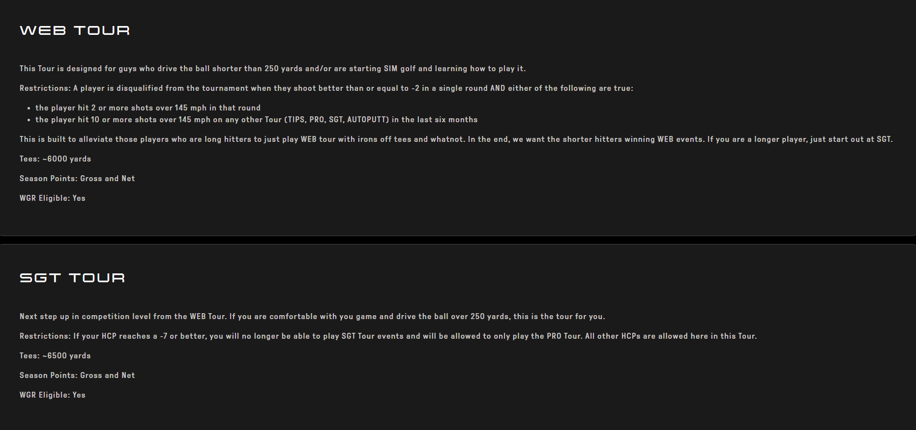 Before even picking a specific tournament, you will have a wide amount of categories to choose from. (Web Tour, SGT Tour, Pro Tour, Tips Tour, ect) When choosing from one of these categories, it’s important to look at the tees length, possible restrictions, format, and other possible assistance given in the tournament. Clicking “Learn More” under any tour will show all details pertaining to each tour.
