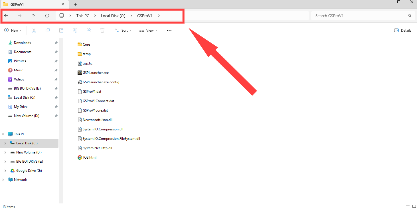 Once File Explorer is opened, we will need to locate the file for GSPro (GSProV1). This file by default will be located under the Local Disk (C:) drive. If you manually downloaded GSPro to another drive, locate the file GSProV1 under that drive instead. Once you’ve found the GSProV1 File, go ahead and left click it twice to open the file. This is what my path looks like so far: