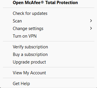 From here, right click the red arrow icon. From the dropdown options, select “Open McAfee Total Protection”.