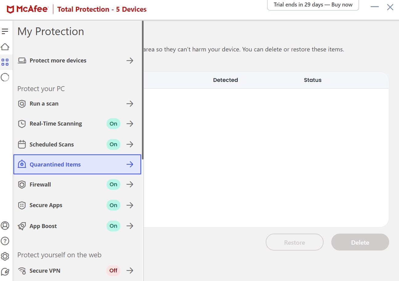 Now that McAfee is launched, click on the “four dot” icon found on the left side of the app. From the dropdown shown, select the “Quarantined Items” tab. This is where all flagged files will be held.
