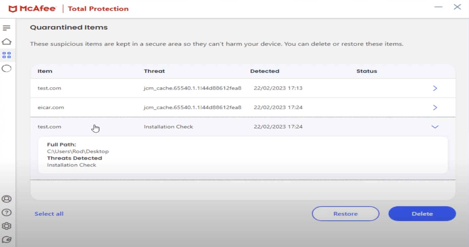 The process to “restore” files quarantined from McAfee is pretty simple. Locate the file in question. (For example: GSProV1Connect.dat) Click on the file name, then click “Restore”. This will allow the file to work as intended again. However, McAfee will shortly after run another scan. (Potentially quarantining the same file again) To get past this, you’ll need to create an exception for that file.