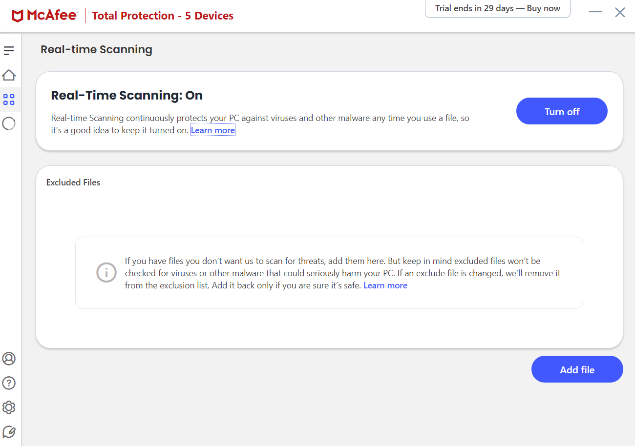 To create an exception for a specific file, you’ll want to head to the same dropdown menu as shown before. This time, you’ll select “Real-Time Scanning”. You can ignore turning off Real-Time Scanning for now, as it’ll only temporarily fix the issue. Instead, click on “Add File” found in the bottom right corner of the application: