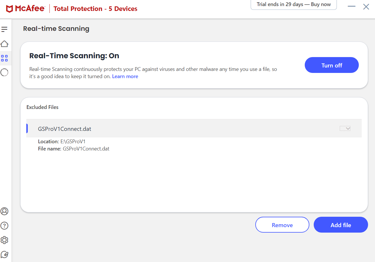 Before going into fixing a potentially flagged file for GSPro, the easiest/best method to prevent this is to delete McAfee as a service from your PC. If the service is no longer needed or active, I’d recommend deleting McAfee from your PC. If you’d wish to keep McAfee on your PC, please continue below.