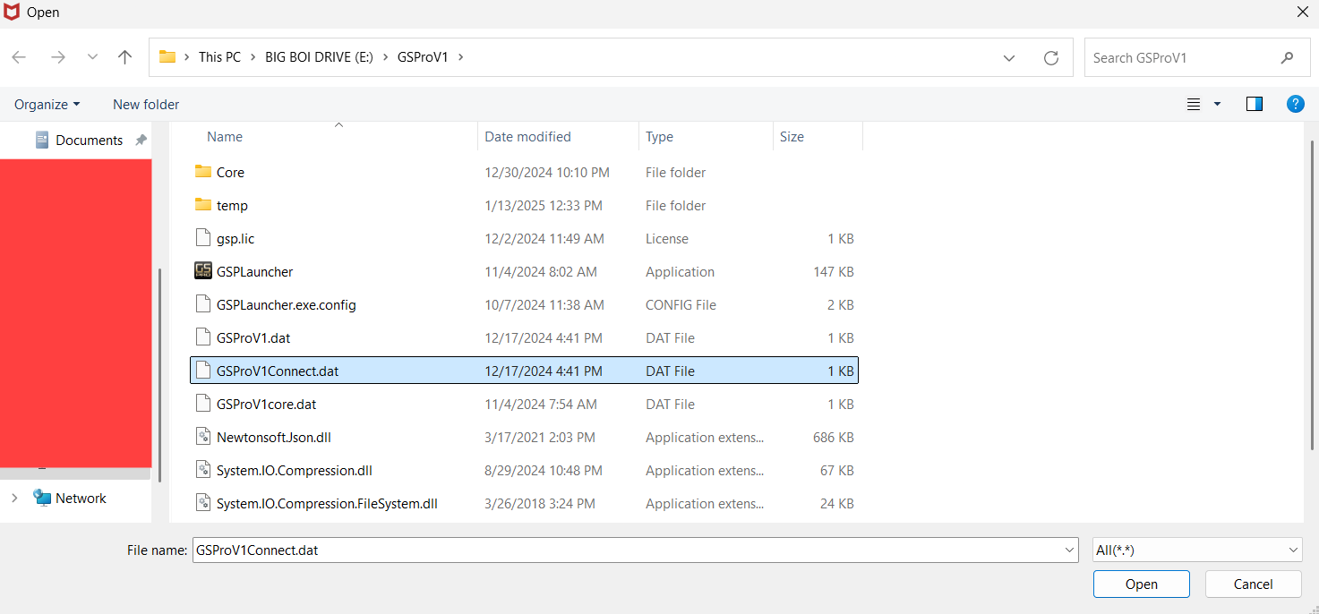 McAfee will prompt you with a similar screen to what File Explorer would show. From here, you will need to navigate to the exact desired file. If you are unsure of the file’s path, McAfee creates a handy path guide for the file’s location in the “Quarantined Items” tab. (If you still aren’t able to locate the file, feel free to reach out to our support email) In my reference, I’ll stick with the example of the “GSProV1Connect.dat” as my targeted file. You’ll click on the targeted file then click “Open” in the bottom right corner of the screen: