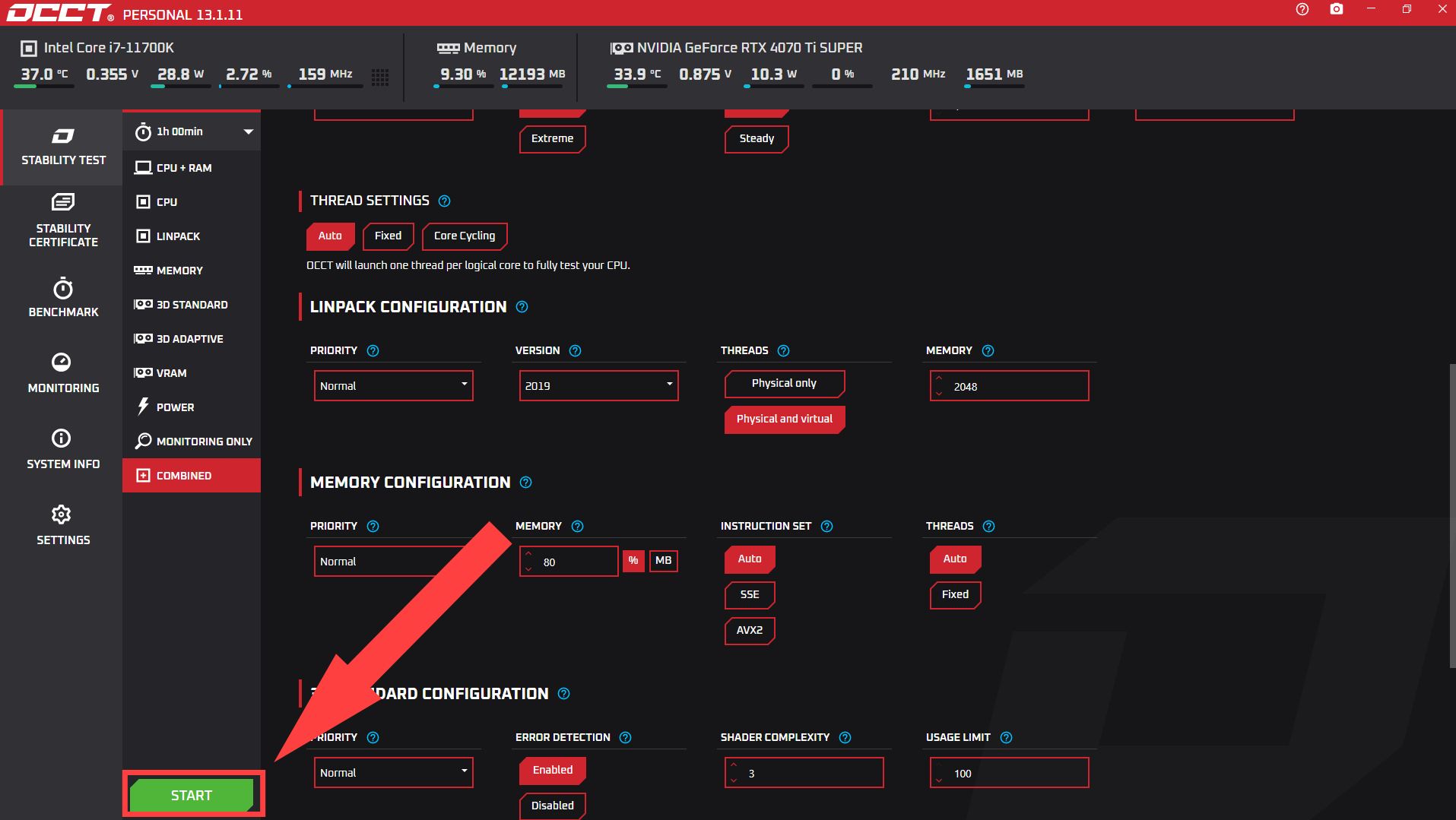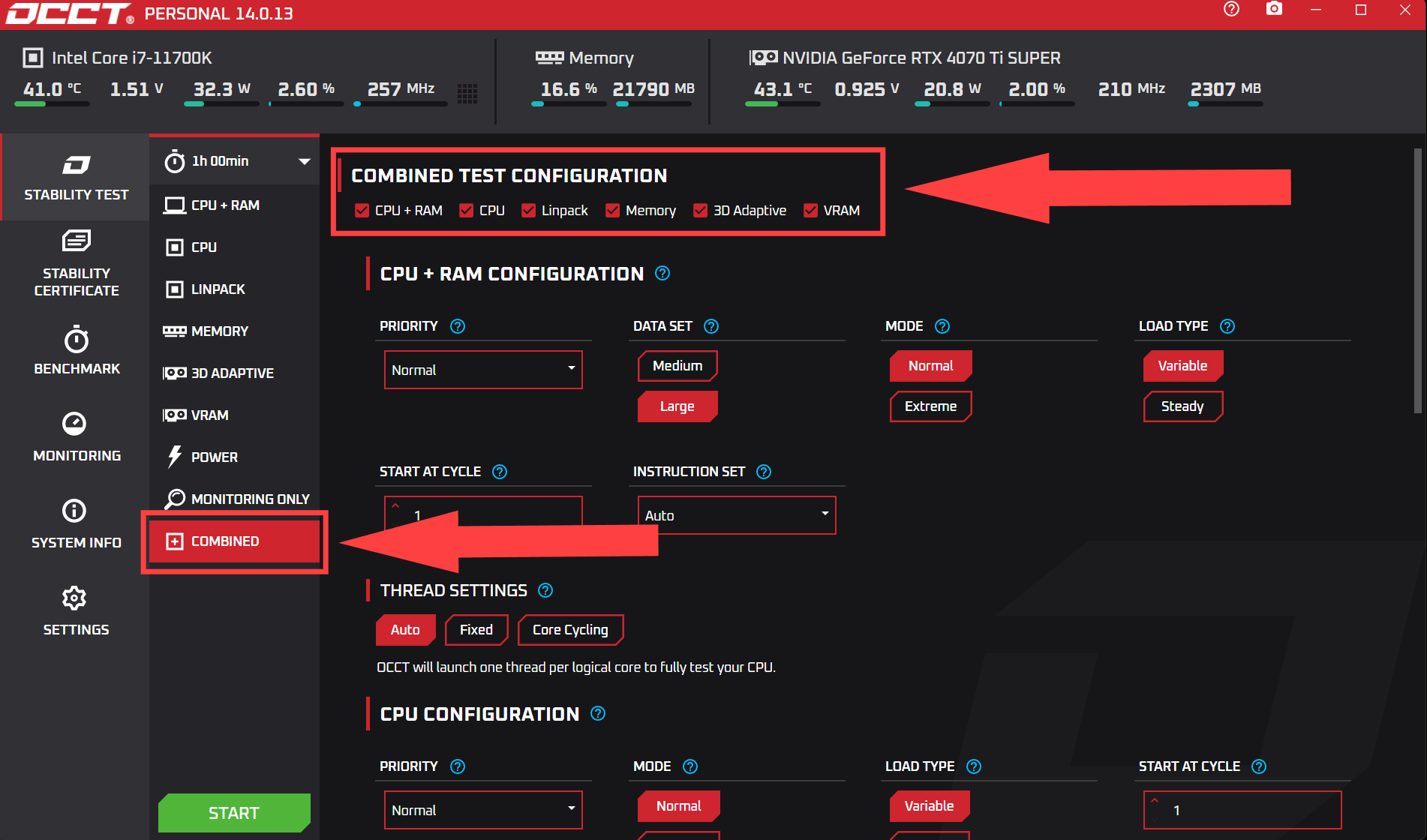 For the most effective test, all options should be scanned in a “Combined” test. OCCT is pretty good about choosing the best settings automatically based on what hardware you have. Locate and click Combined under “Monitoring Only”. You’ll be represented with the full array of tests you’ll want to select. (CPU + RAM, CPU, Linpack, Memory, 3D adaptive, and VRAM):