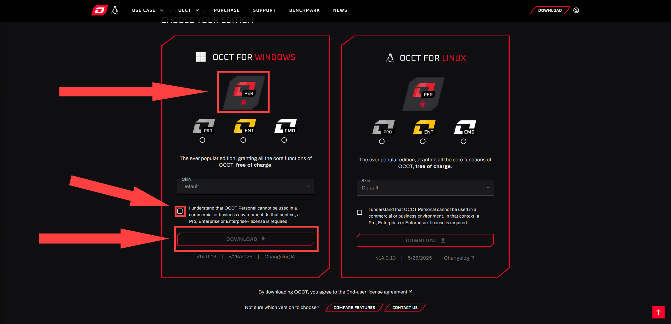 Once done, you’ll be redirected to the download page. Ensure the “PER” option is selected in the “Windows” box on the left. Accept the terms below, and select “Download”: